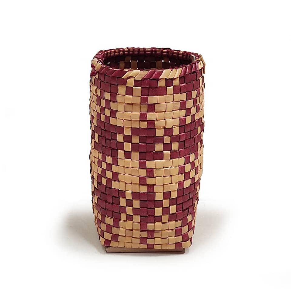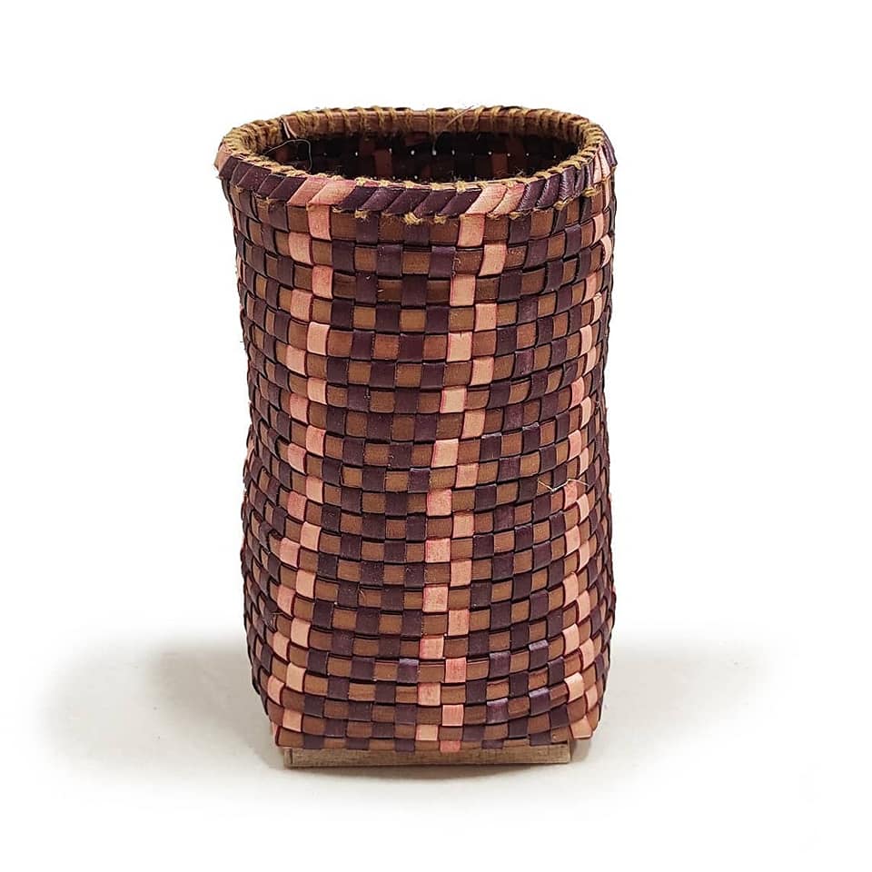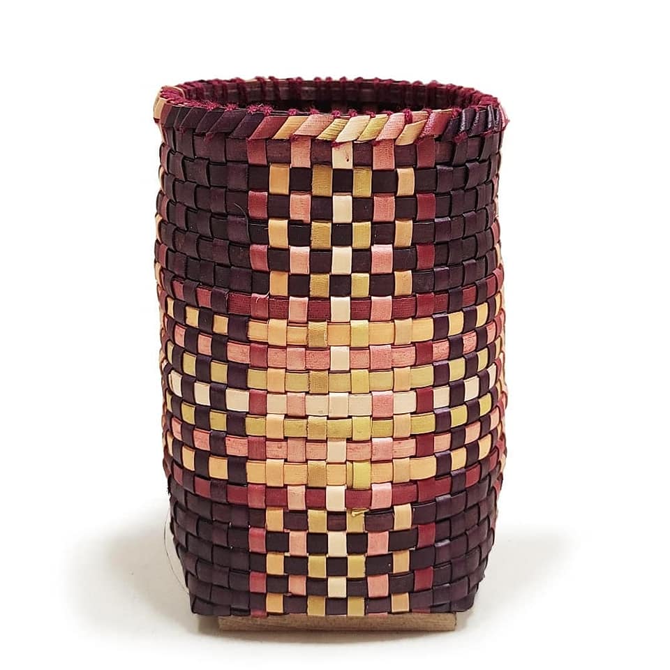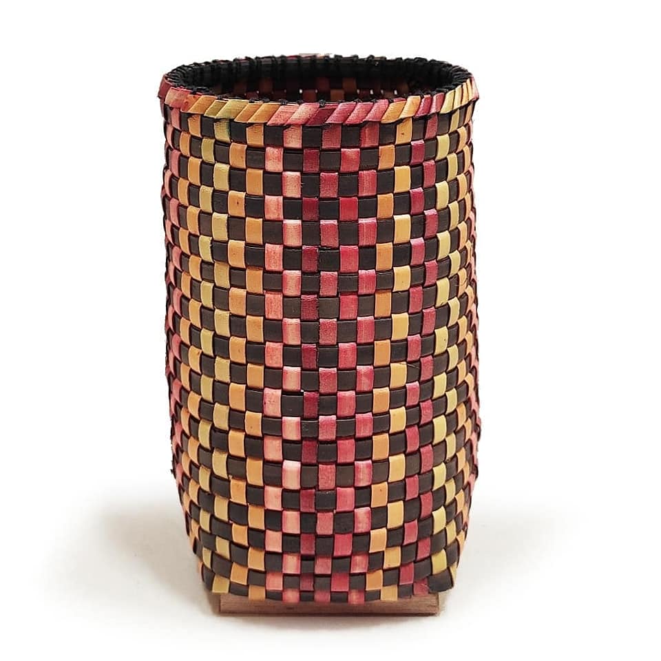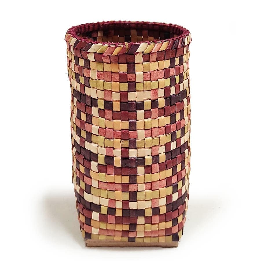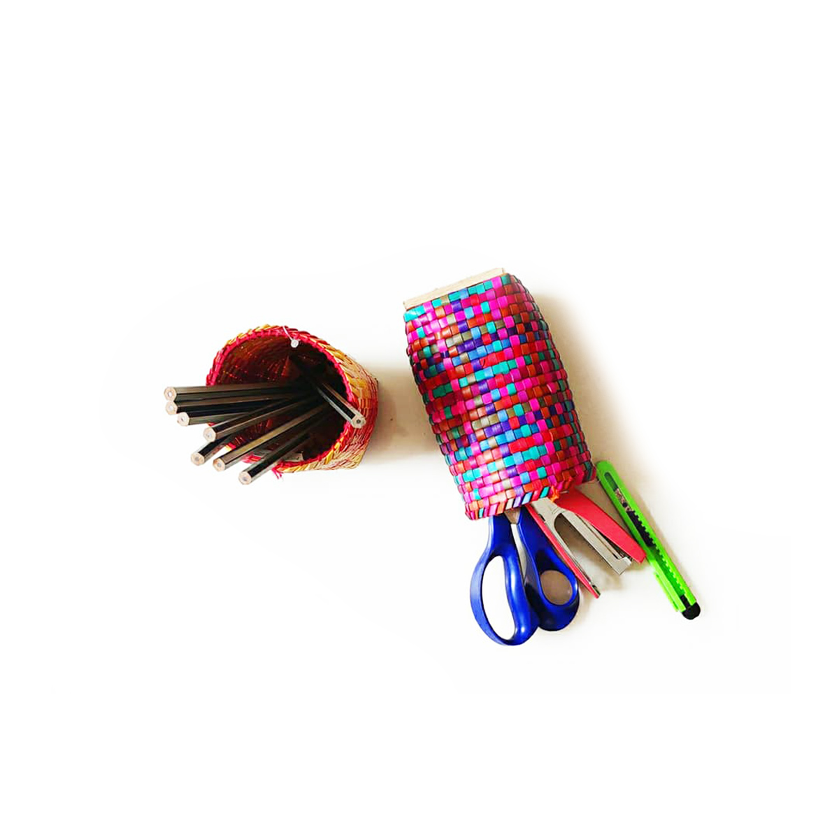 Colourful Palm Leaves are woven with a traditional weave pattern to create this elegant Pen Stand. Adds colour and beauty to your home and office. Can also be used as a Spoon stand or as a small Vase.