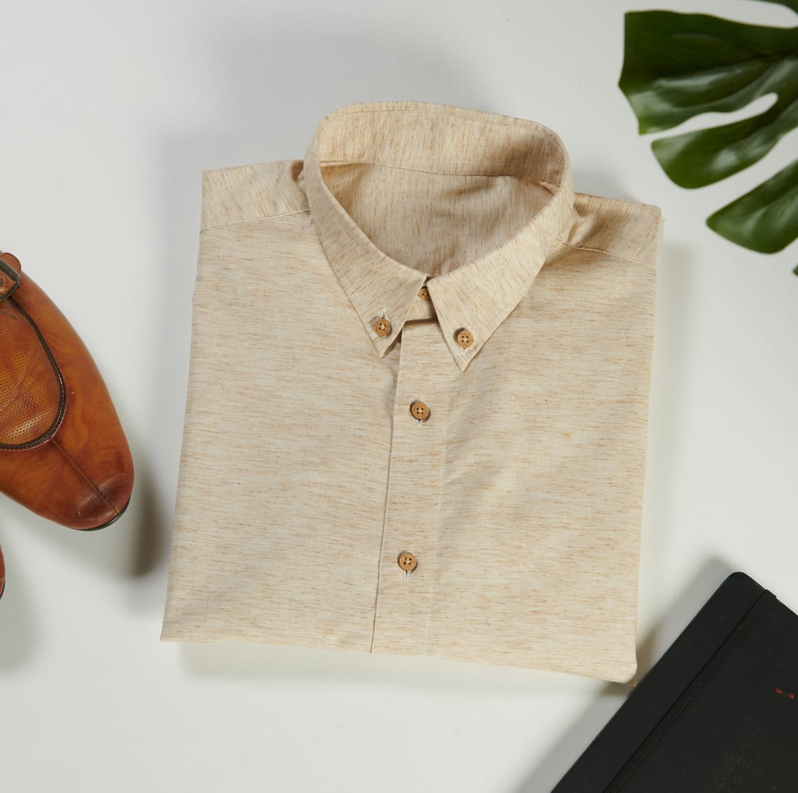 Beige solid casual shirt, has a button-down collar, button placket, 1 pocket, long sleeves,