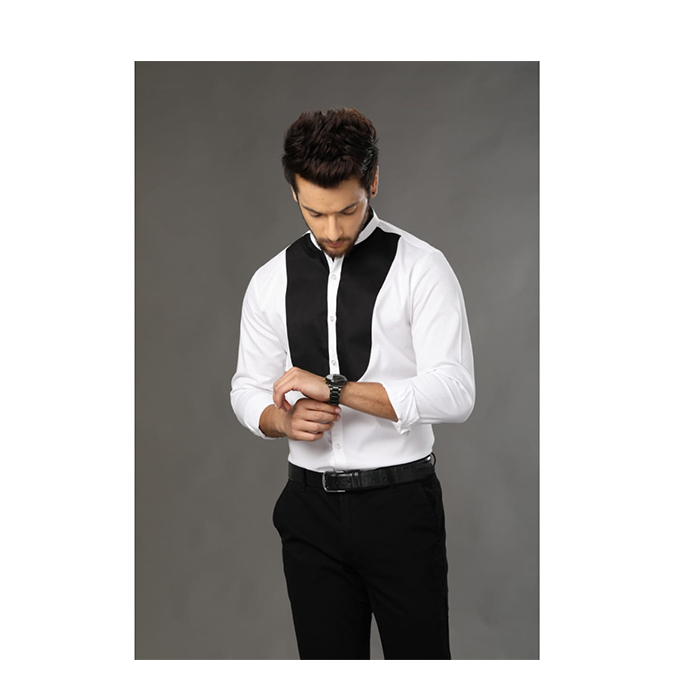 Black/White formal shirt, has a button-down collar, button placket, 1 pocket, long sleeves,