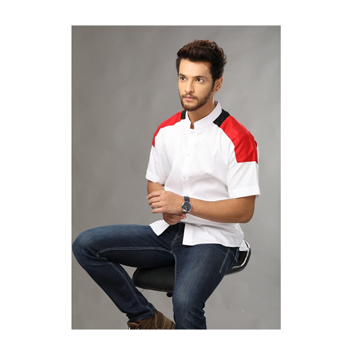 White/Red casual shirt, has a button-down collar, button placket, 1 pocket, short sleeves,
