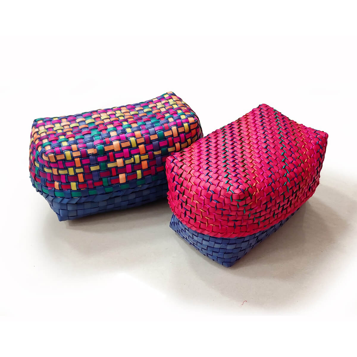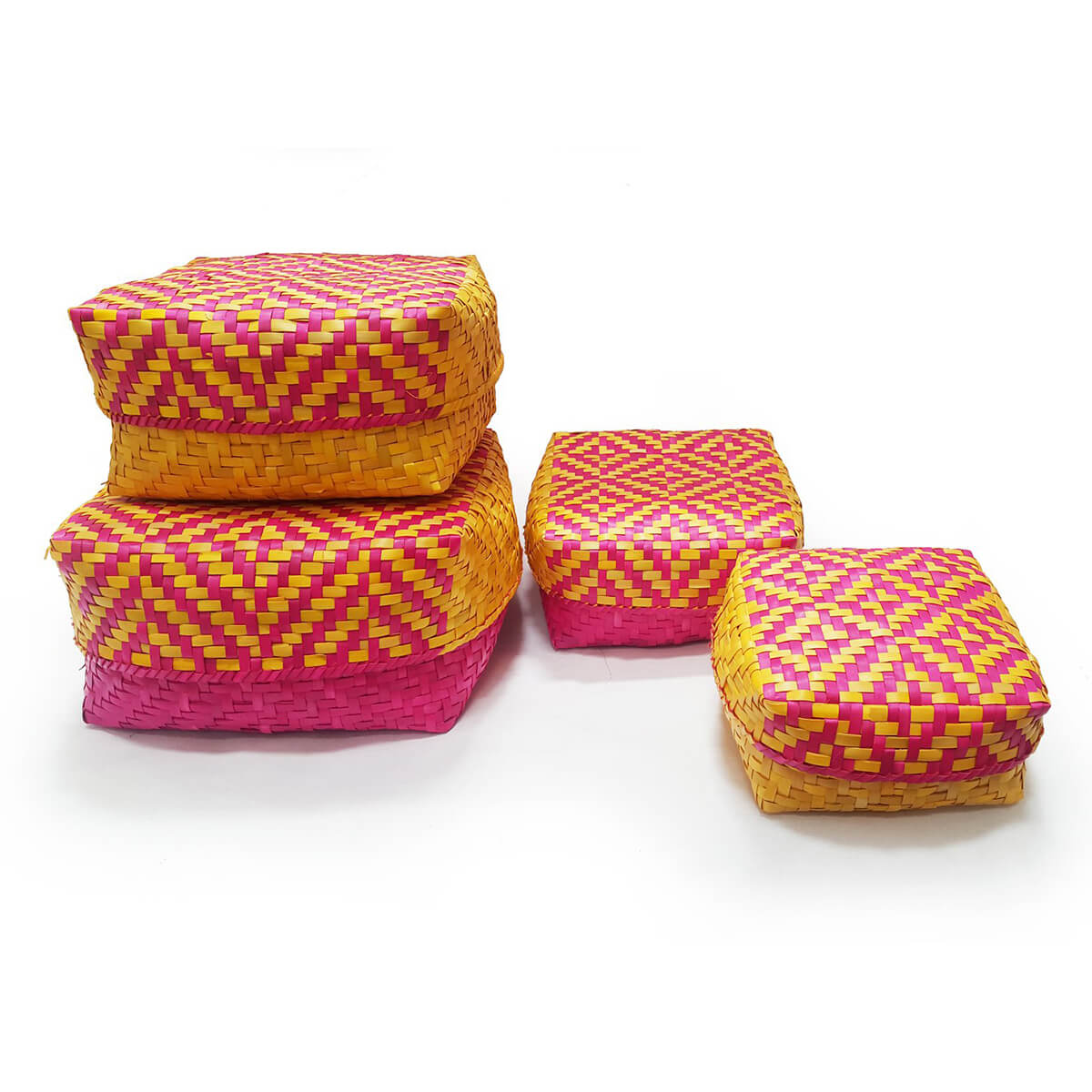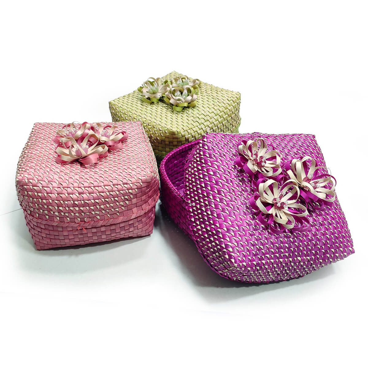 Colourful Palm Leaves are woven with the traditional weave pattern of Kottan to create these beautiful Saree Boxes. Can be used for storage as well as gifting.