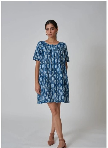 this handwoven pleated shirt dress features semi-long, spaced out sleeves, a distinct collar, and is dotted with minimal hand embroidery to set you off on an evergreen journey.