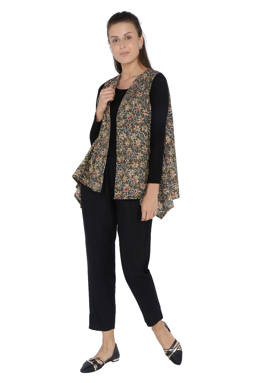 This green coloured shrug is crafted cotton and features a v neck, sleeveless, a regular fit and block printed all over.